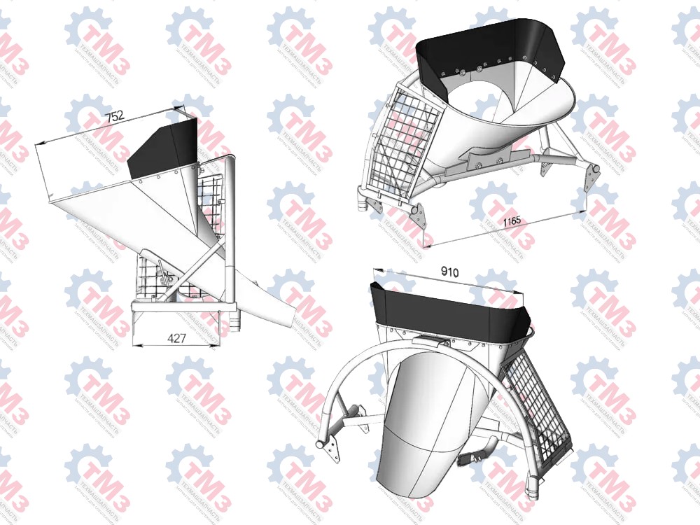 Воронка или лоток загрузочный - конструкция, предназначенная для загрузки миксера товарным бетоном на растворно-бетонных узлах. Предлагаемая комплектация - в сборе с кронштейном-дугой и воротником.